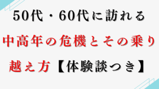 中高年の危機対処法 50代・60代に訪れる中高年の危機とその乗り越え方【体験談つき】 中高年になると、健康や仕事、家庭などのさまざまな場面で「これまで通りではいかない」と感じる瞬間が増えてきます。人生の折り返し地点を過ぎ、自身の価値や存在意義について改めて考え直すこともあるでしょう。本記事では、そうした中高年が直面する危機の... 2024.10.05 中高年の危機対処法